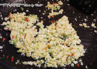 5 、放入蒜末香菜末及辣椒末,用中小火慢慢炒出香味 (记得火不要太大,以免蒜末会焦掉)。