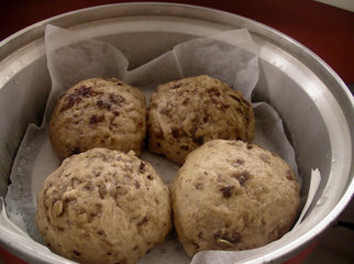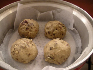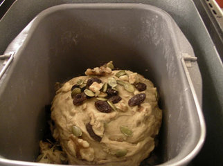 配料:水200ml,黑糖40g,酵母粉4g,南瓜子. 葡萄干. 核桃少许