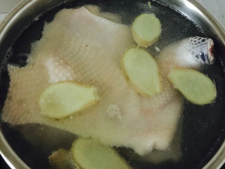 2 、煮ㄧ锅滚水放入姜片,再放入腌好的鸡腿肉,煮至熟成。