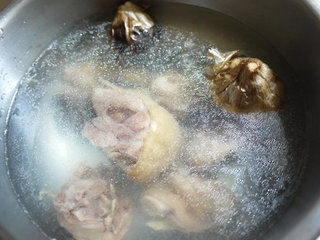 2 、取一锅滚水,先川烫鸡肉5分钟再用水冲去杂质,汤锅放入黑蒜头、姜片、米酒和鸡肉,注入冷水至7分满,盖上锅盖煮滚后转小火炖40分钟或鸡肉喜爱的软硬度。