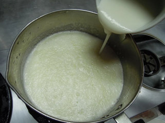 4 、用果汁机将马铃薯与洋葱打成泥,倒入白酱中。