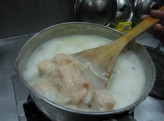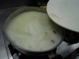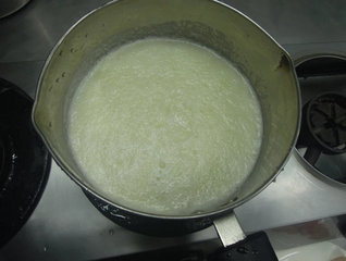 马铃薯打泥用锅煮要一直搅拌,才不会焦掉,浓度可依个人喜好调整。
