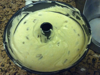 4 、倒入底部铺上烘焙纸的9寸中空活动烤模,轻敲二下震出大气泡。350°F烤约25-30分钟。