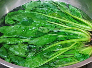 2 、将菠菜放入加盐巴的滚水中川烫。