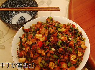 做法:雪菜洗净脱盐后挤干水分切碎,豆干切小丁备用,干锅先把雪里红在锅内干煸去除水分盛起备用,起油锅爆香蒜末.辣椒末,下肉末炒香,下豆干丁煸香,下雪里红大火翻炒,下盐.糖.呛酒.酱油少许.胡椒粉,起锅前下香油少许即可出锅装盘。