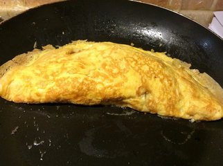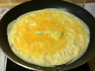 2 、将蛋液倒入平底锅,煎成蛋皮。