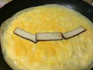 3 、炸酱面里的豆干平铺在蛋皮上。