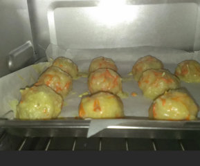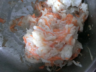 1、1.马铃薯萝卜刨丝,放电锅蒸(外锅1杯水) 2.蒸好放到温温的,加入小块奶油,抓一抓。