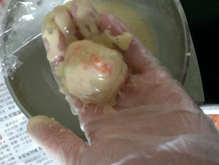 5 、整颗放入蛋糊,拿起可用汤匙把多余的蛋糊刮除。 (整型时,只需要一只手,另一手完全不沾)。