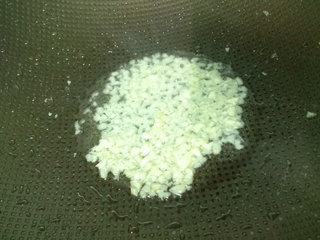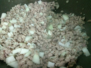 3 、绞肉加进来炒至肉色变白, 沿着锅边呛入米酒稍微翻炒均匀, 再加入洋葱丁,炒至变软出水。
