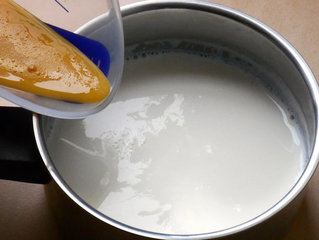 3 、鸡蛋打匀, 加入牛奶液中混合均匀。