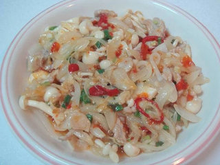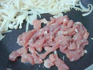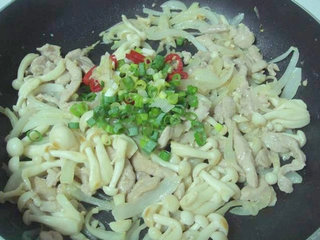 猪肉丝100g,雪白菇1包,洋葱1/2个,辣椒1根,青葱1只,蒜末1大匙