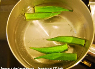 2 、秋葵先用盐巴搓洗,用清水洗净后,放入加了少许盐巴的滚水中,入锅汆烫约2分钟,捞起后泡冰水备用。
