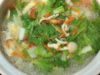配料:小白菜2株,鸿禧菇一大把,红萝卜1段、5公分牛番茄1/2个,姜末1大匙,白胡椒粉2小匙
