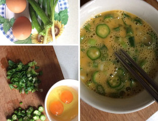 1、将食材清洗干净后,葱及秋葵切小丁,打蛋再将葱、秋葵及少量水放入ㄧ起扮匀。