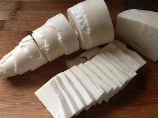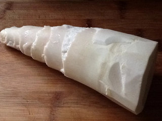 2 、将竹笋切段再切半,半再切成约0.2厚度的片状。
