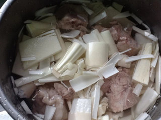 4 、重新起锅,放入排骨与竹笋,加水,开大火煮滚5分钟后,改中小火续煮约20-25分钟。