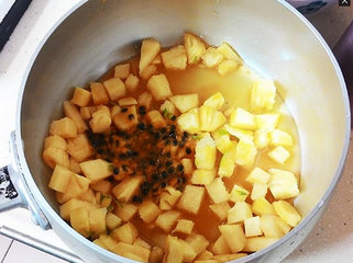 1、将凤梨切丁,加两颗百香果。柠檬加半颗的柠檬皮进来增加香气(只要绿色的表皮,不要削到白色的部分),再加一颗柠檬汁,8大匙的糖。和200cc的水。 全部放到锅里煮15分钟。