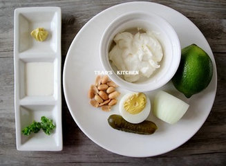 美乃滋4T,迪戎芥末酱1/2t,鲜奶油1T,柠檬汁1t,水煮蛋半颗,洋葱1/8颗,盐1/8t,酸黄瓜1小条,花生10颗,巴西里少许