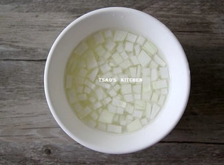 3 、小秘诀:洋葱切碎后泡冰水1分钟沥干,可去除辛辣口感。
