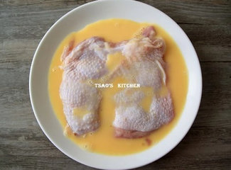6 、将鸡腿沾匀蛋液。(剩余的蛋液可再利用其他料理中)
