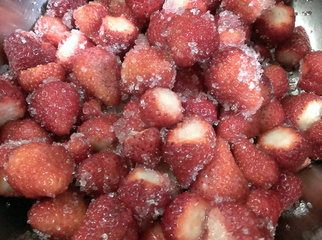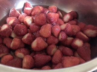2 、冰糖加入草莓中拌匀,以保鲜膜封口后将草莓放入冰箱。