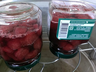 在装瓶锁罐后马上倒置是为了真空消毒。我会再进电锅蒸一次消毒瓶身与瓶盖,这样的果酱放冰箱一个月没有问题。另外糖份我有减少,若是较爱甜的人可以再加。