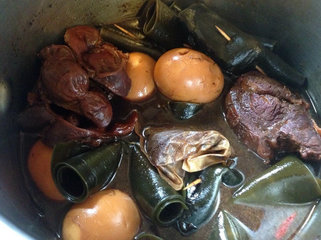 1、将卤汁的材料全部放入压力锅里,然后放入洗净的鸭珍,和一条牛腱,按各家压力锅指示操作压力锅,我的是TEFAL的压力锅,时间30分钟即可炖出软而不烂,香Q好吃的卤鸭珍和牛腱,这时我还会加入煮好的鸡蛋,和海带再煮个15到20分钟,这个不用加压,只需放进去一起卤就可以了。