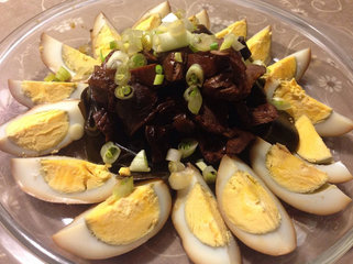 2 、将鸭珍,牛腱,海带都夹起来,放在保鲜盒里,凉了以后,放入冰箱,而卤蛋留在卤汁里,至少3个小时,让它更入味,之后也是夹出来冰,随吃随切,要吃的时候,淋上一些麻油,撒上葱花即可!