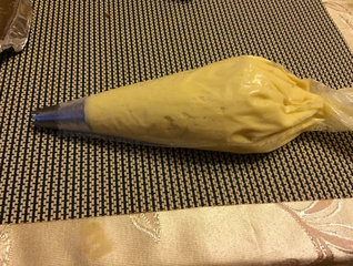 4 、放入挤花带中...挤出来中间要留一点点小洞放入焦糖。
