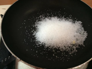 5 、起锅放入糖...不需要搅拌它,如果你想要它平均,晃动你的锅子就好。