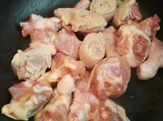 2 、起锅将鸡腿肉干煸出鸡油。