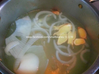 1、姜切成姜片,我这边切成10mm约8片 将米酒、1/4洋葱与姜片入汤锅熬煮成高汤。