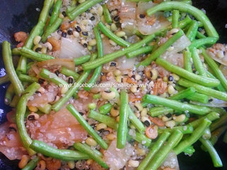 3 、热锅,一点点油抹锅 猪肉丝下锅稍待微微爆出点油 剩余的洋葱与开阳入锅后有香味出来 放入菜豆拌炒。