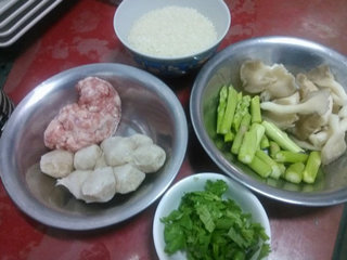 主料:白米1杯,芦笋4~6根,鱼丸8~10颗,猪绞肉30公克,秀珍菇10公克,芫荽或芹菜适量,红萝卜适量