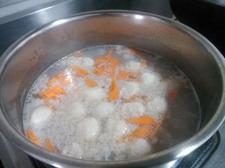 2 、白米洗净后,与鱼丸、猪绞肉、红萝卜一起放入锅中,然后加入适量清水,先以大火煮至沸腾,然后转中火。