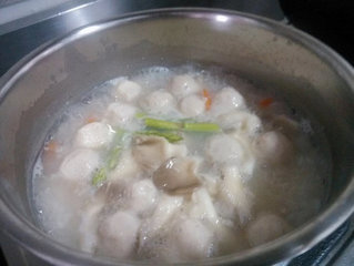 1、芦笋切成段状;芫荽或芹菜切碎;鱼丸、秀珍菇洗净;青葱切成葱花;红萝卜切成菱形小片。