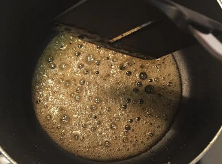3 、煮糖, 糖:水约3:1, 在糖全部冒大泡泡融化前不要搅动锅子, 搅动锅子容易失败, 糖会先冒大泡泡, 接着变小泡泡, 很多小泡泡浓稠状, 出现焦糖淡黄色, 用锅铲拉起时会有超细的糖丝, 大概全程用小锅的话煮约5分钟。 出现淡黄色后停火, 将刚炸好的地瓜快速下锅, 或糖浆拌匀。