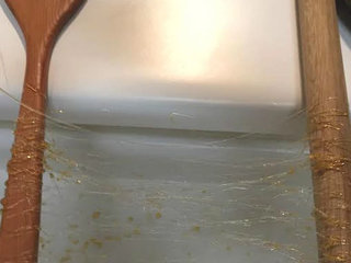 4 、糖丝球部分, 是用汤匙/叉子等, 沾一点淡黄色焦糖液, 然后快速来回甩动, 即会看到超细糖丝, 稍微揉成球状极为糖丝球。