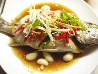 6 、保留蒜末,但姜片及葱段取出不要,将1大匙的蒸鱼酱油均匀的淋在鱼身,放上辣椒丝、姜丝、葱丝,淋上1大匙香油,重新放入锅中,以大火蒸约3~4分钟即可。