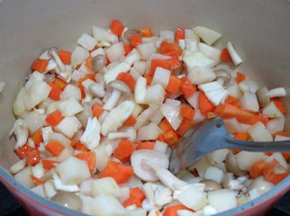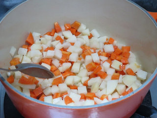 2 、热锅少油炒红萝卜、马铃薯,炒香并略炒软。