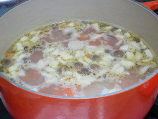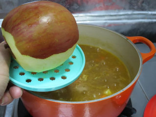 7 、红萝卜、马铃薯软后再现磨苹果泥,略滚3分钟。上盖关炉火,让它续焖到更软。(这样更省瓦斯)