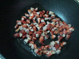 2 、平底锅中加入少许的油(也可不加油因为等会叉烧会出油) , 把叉烧煎炒至干身。