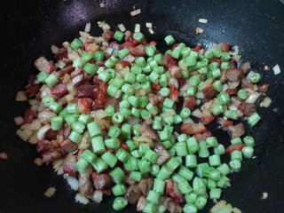4 、再加入豆角, 此时加盐调味 ( 不用加太多盐, 因为叉烧本身已有味道 )。
