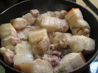 2 、取一炒锅,加入两大匙油,放入三层肉,中火用半煎炸的方式将肉块煎至表面金黄微焦 (以利外型完整,卤过之后不松散)。