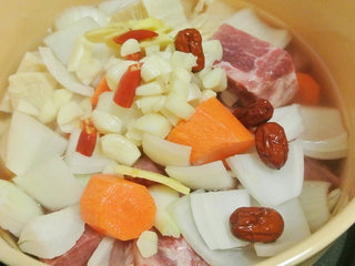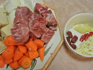 主料:牛肉半斤,红萝卜2根,冻豆腐1块,红枣1小把