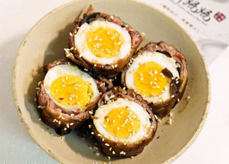 3、猪肉片放入适量的红椒麻辣黑菇酱后,直接包覆水煮蛋。