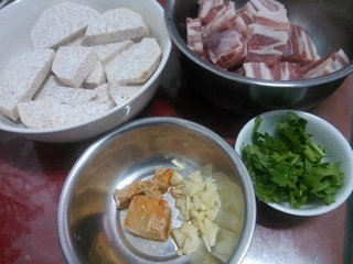 1、五花肉切片,每片约1公分厚;蒜头切碎;芫荽洗净切细(蒜苗切丝);芋头去皮洗净切厚片,然后摆在深瓷盘的底部。