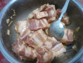2 、豆腐乳加上适量米酒与少许酱油、香油打成酱汁,再与五花肉拌匀,放到冰箱腌10~15分钟。