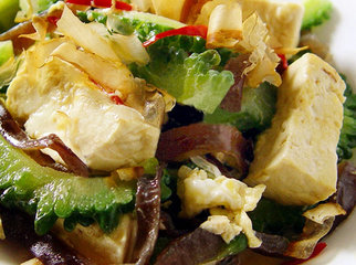 主料:青苦瓜250克,板豆腐1块,鲜木耳丝30克,鸡蛋1个,蒜末10克,柴鱼片适量,辣椒丝少许